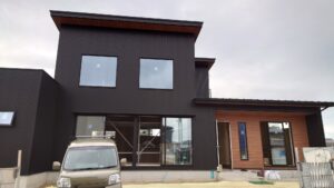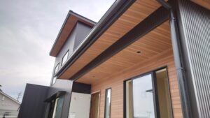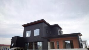 黒のガルバニュウム鋼板の壁に、木柄サイディング