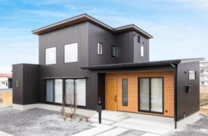 真っ黒い外壁に、レッドシダーのポイントが優しい家。