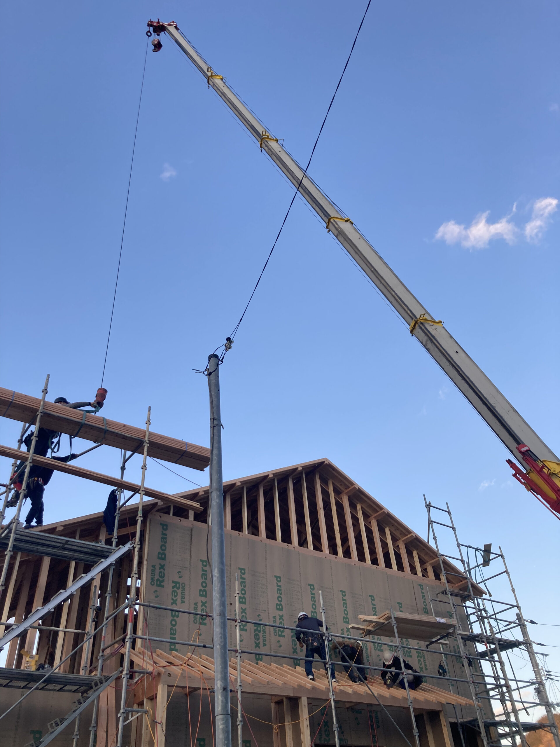 大工とクレーン車の息が合わないと順調に進みません。