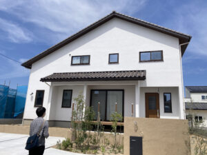 漆喰塗のmomoHausをバックにアプローチ、ウッドデッキ、植栽の相性もばっちりです👍